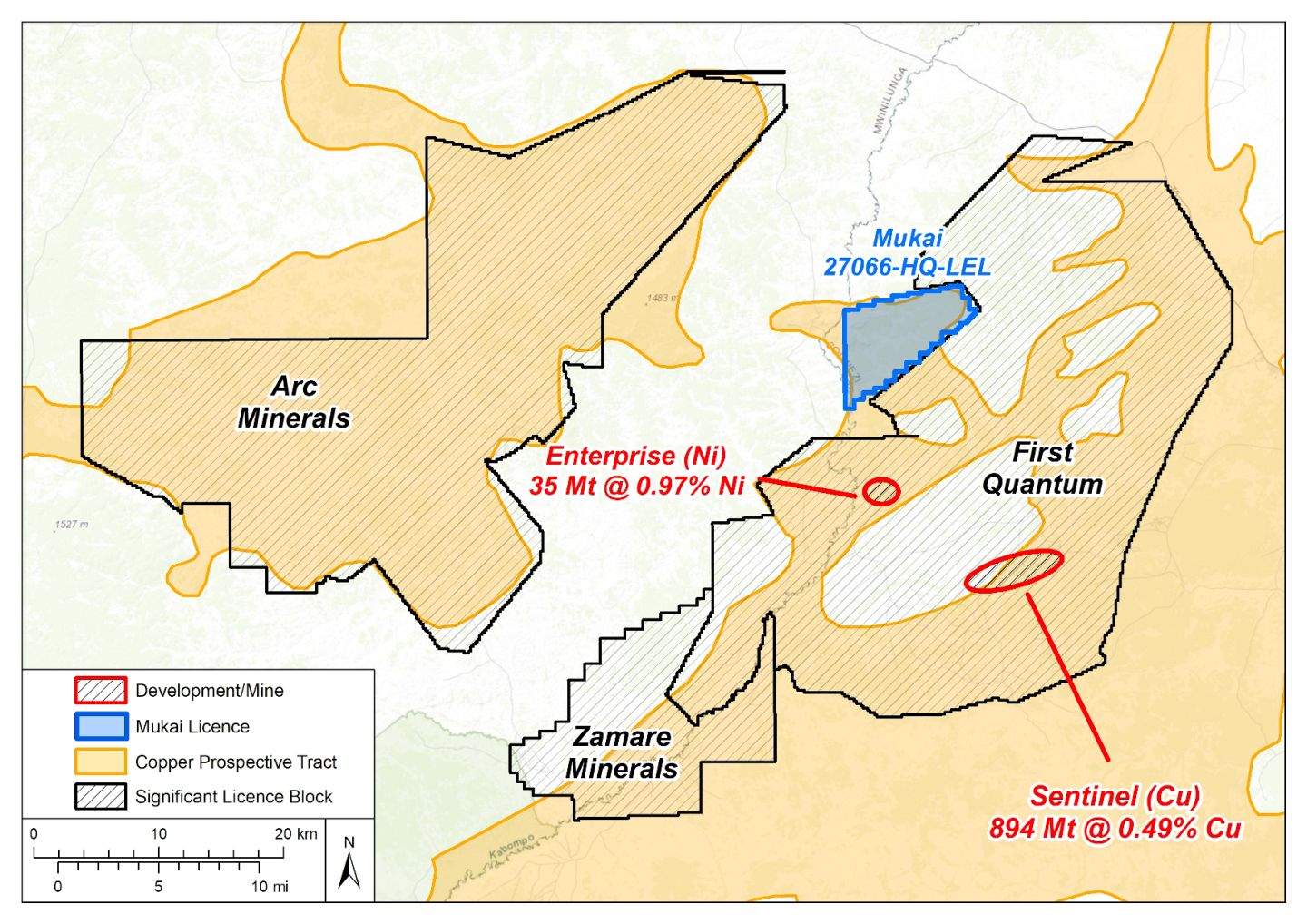 The Mukai Project is also located just to the west of Arc Minerals’ project area on the opposite flank of the Kabompo Dome, where Anglo American can earn a 70% interest from Arc Minerals through expenditure of US$88.5 million, including US$14.5 in cash payments.